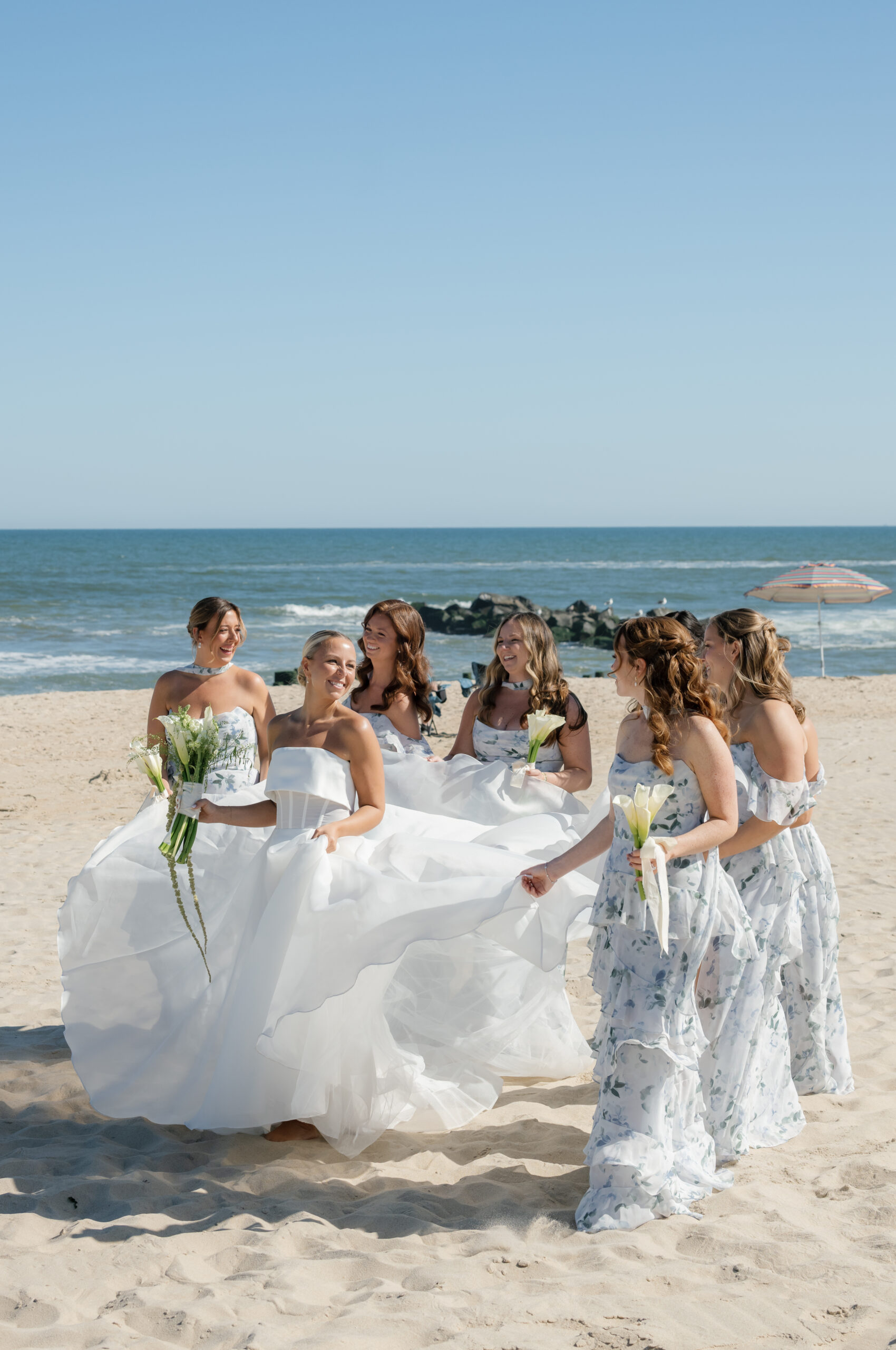 Their first look took place along the Spring Lake boardwalk and beach. This quickly became one of the most memorable moments of the day. Surrounded by the natural rhythm of the shoreline, the scene felt effortless and organic. In addition, beachgoers offered warm congratulations and even lent their chairs for portraits. This added to the sense of community and spontaneity.