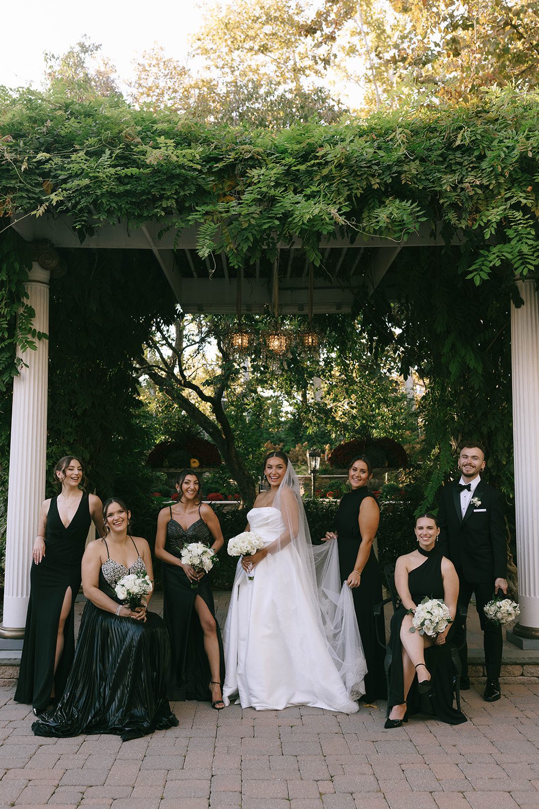 A refined palette of black, white, gold, and greenery created an atmosphere that felt effortlessly elevated while remaining warm and inviting. The design beautifully complemented the gardens and architecture of Nanina’s in the Park, evoking the romance and intimacy of a Tuscan villa.